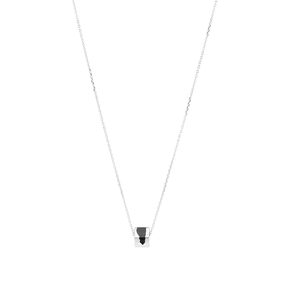 Emerging designer Ellie Mercer has created a niche in experimental jewellery, with organic shaped resin and sculptural forms creating one-of-a-kind pieces. This necklace showcases the designer’s usual style, where a sterling silver geometric cube pendant is contrasted with an black ‘puddle’, hanging on a chain.