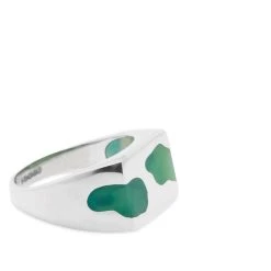 Ellie Mercer is a London based brand that specialises in bending precious metals with bunky resin details that add a pop of colour to any look. The two piece resin ring is made to a chunky square signet ring style with two organic, flowing shapes of green resin.