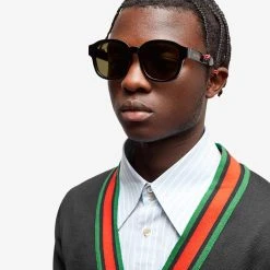 These classic black sunglasses from Gucci Eyewear are the perfect holiday accessory. Crafted from smooth acetate and moulded to a rounded shape, the pair are fitted with green tinted lenses then engraved at the temples for a signature touch.