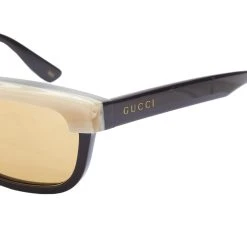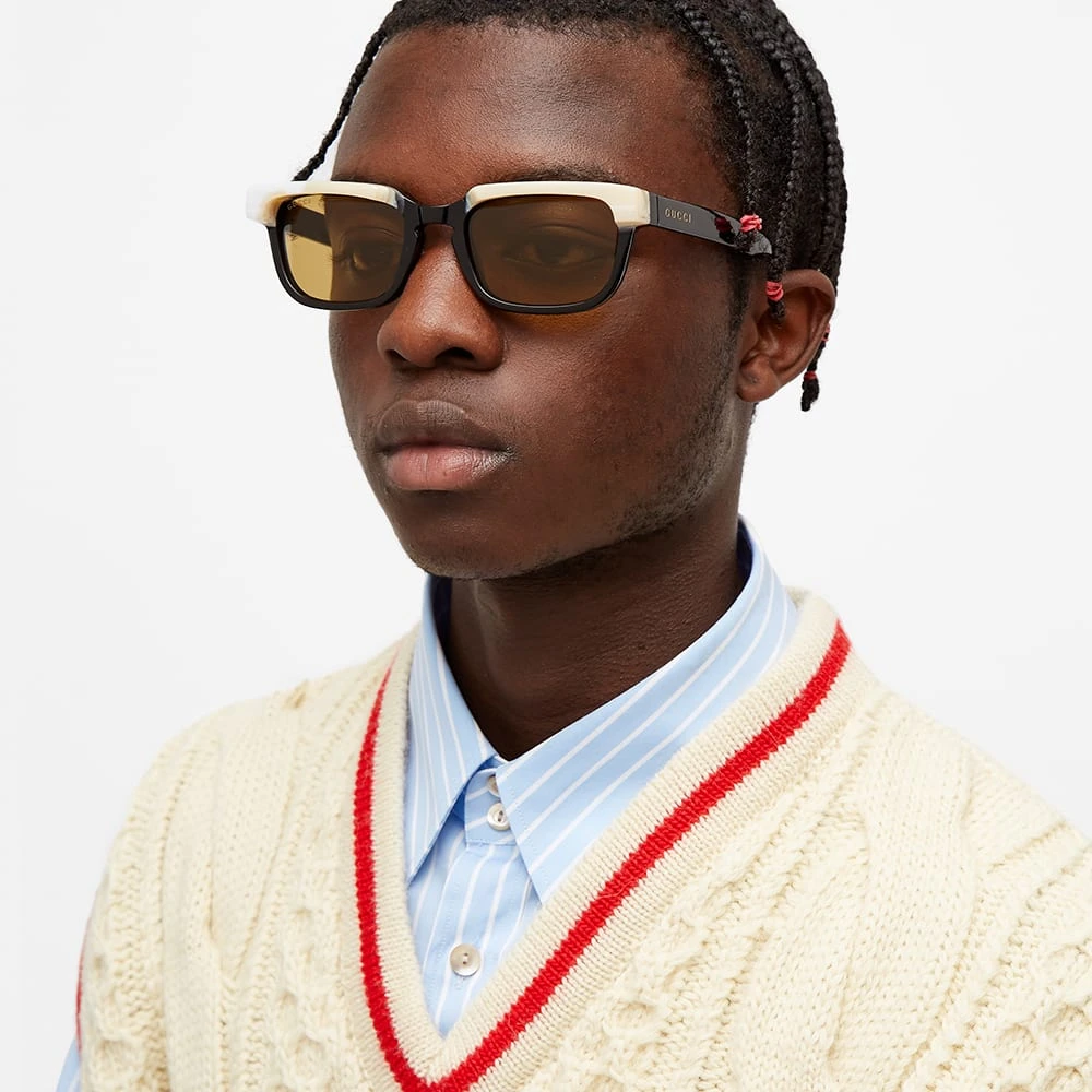 These Gucci Eyewear sunglasses showcase a futuristic and edgy look thanks to their extended detailing above the yellow tinted lens. Crafted from smooth black acetate, the pair are classically signed off with engraved branding at either arm.
