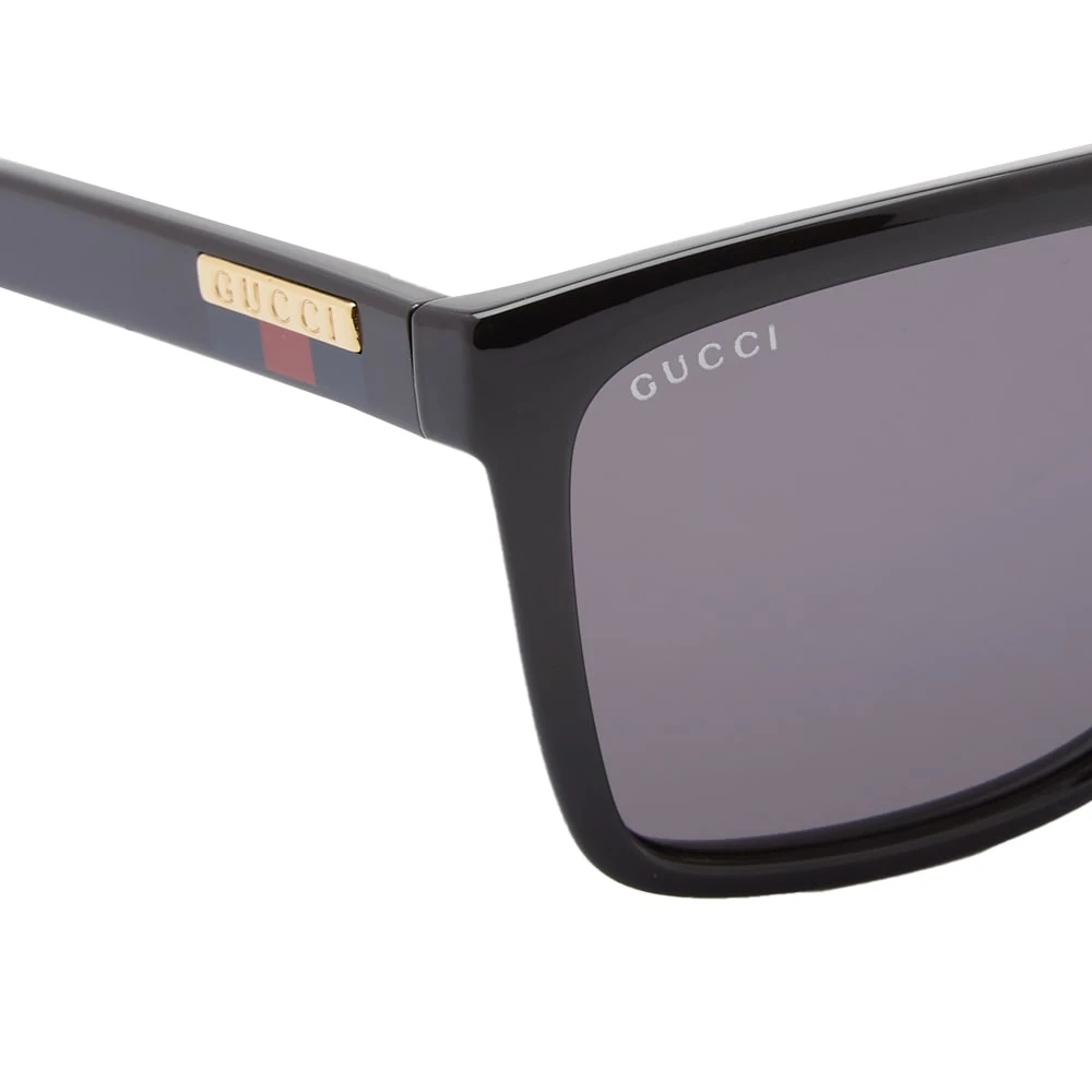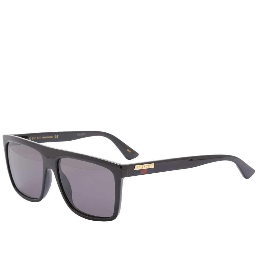 These black Gucci sunglasses are both luxurious and timeless. They’re handmade in Italy with rectangular acetate frames and fitted with grey tinted lenses, while bold dual-tone stripes and a golden plaque at each temple completes the look.