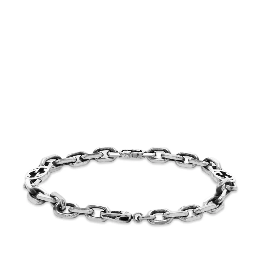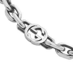 Vintage finishes and archival motifs go hand in hand, and this Gucci bracelet has both. It’s crafted in Italy from antiquated sterling silver, using a sequence of carved cable links and charms shaped into the iconic interlocking G logo.