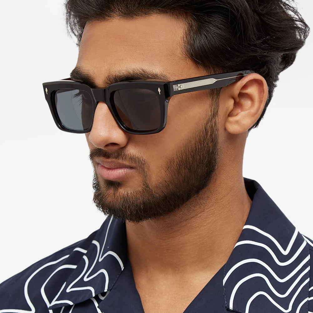 Bold and distinctive, the Torino sunglasses from Jacques Marie Mage are a 60’s-inspired silhouette that take cues from a historic Italian theatre. Their rectangular frames are crafted from cured cellulose acetate and dressed in a black colourway, then detailed with precious metal hardware at the arm.