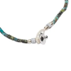 Crafted in Japan, this stylish bracelet from Mikia perfectly demonstrates the brand’s dedication to intricately crafted heirloom pieces. It’s silk cord is strung with turquoise tube beads that highlight the stone’s unique vein pattern and then finished with sterling silver crescent moon clasp for an elevated touch.