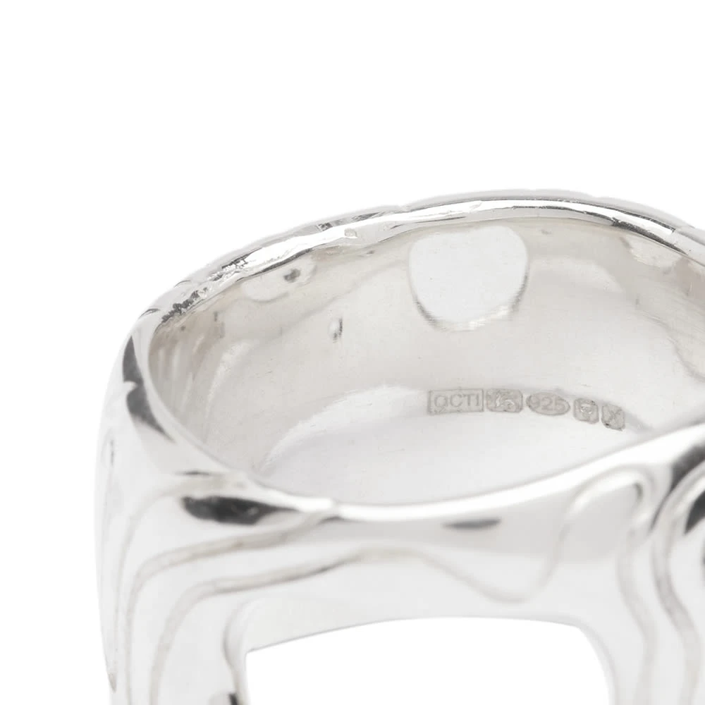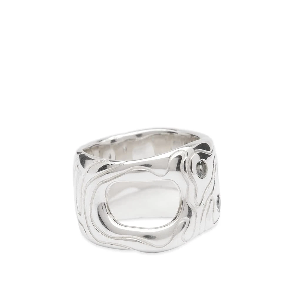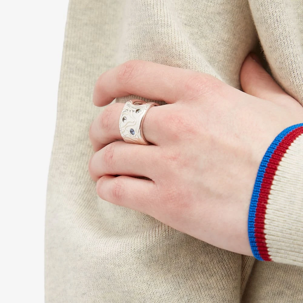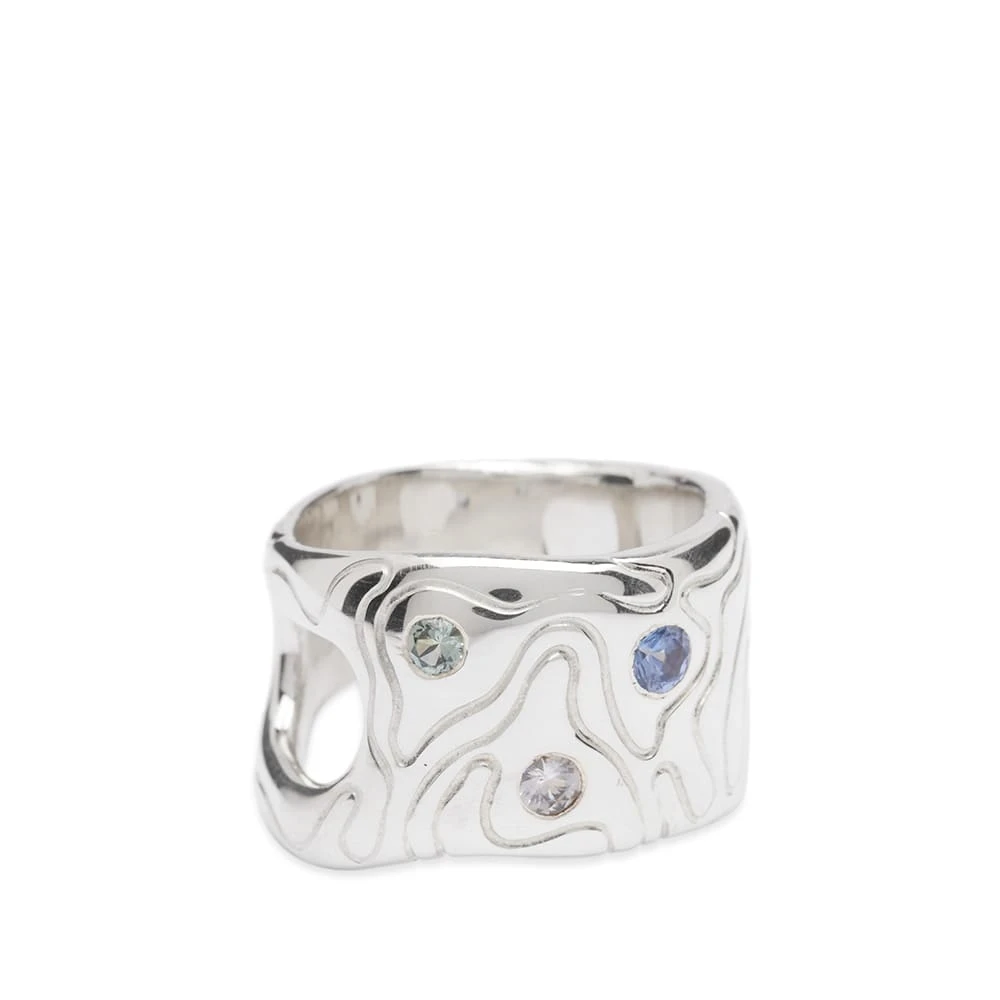 Octi s a responsible, considerate jewellery company owned by sisters Christie & Rosanna. The globe island 003 ring is made from a solid recycled 925 silver as the brand continues to use responsible materials. The 002 aspect comes from three little islands represented as sapphires on the side of the ring. The ring is made with soft curved lines which are reminiscent of topographic lines on a map.