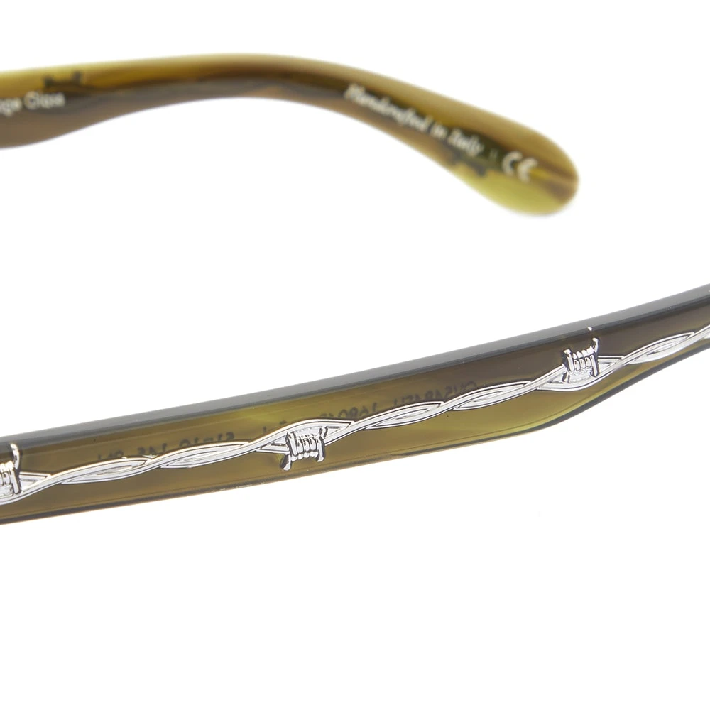 Oliver Peoples collaborates with multidisciplinary creative, Fai Khadra, to design these sleek sunglasses. Crafted from premium acetate, they show off a deep green rectangular frame with tinted lenses – for a classic look – and are detailed with a barbed wire print at the temples for an edgy finish.
