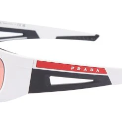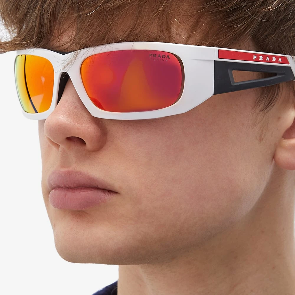 The futuristic-meets-millennial trend re-introduces wrap-around sunglasses to our rotation, which Prada’s Linea Rossa eyewear line is full of. This curved sporty style is designed with orange tinted mirror effect lenses and finished with the label’s signature red branding, adorning the matte white cut out arms.
