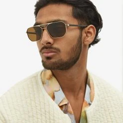 These aviator sunglasses from Prada offer up effortless style. They feature a sleek brown metal frame with dark tinted lenses for a bold look and are complete with metal branding at the bridge.